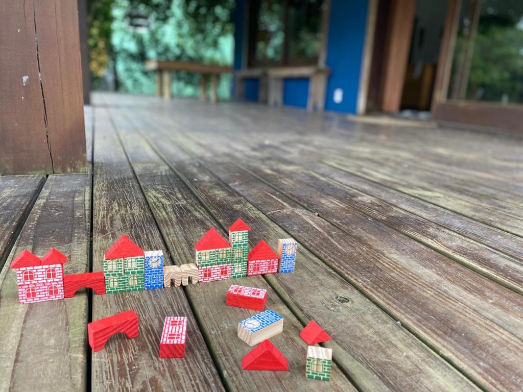 Na varanda, com os olhinhos curiosos da infância, ele capturou a presença de blocos de montar. Contemplando cada pecinha, decidiu reinventar o mundo. O telhado serviria agora de base, as janelas seriam colocadas de ponta-cabeça, as pontes virariam pistas de skate. Tudo ganhava uma nova função.