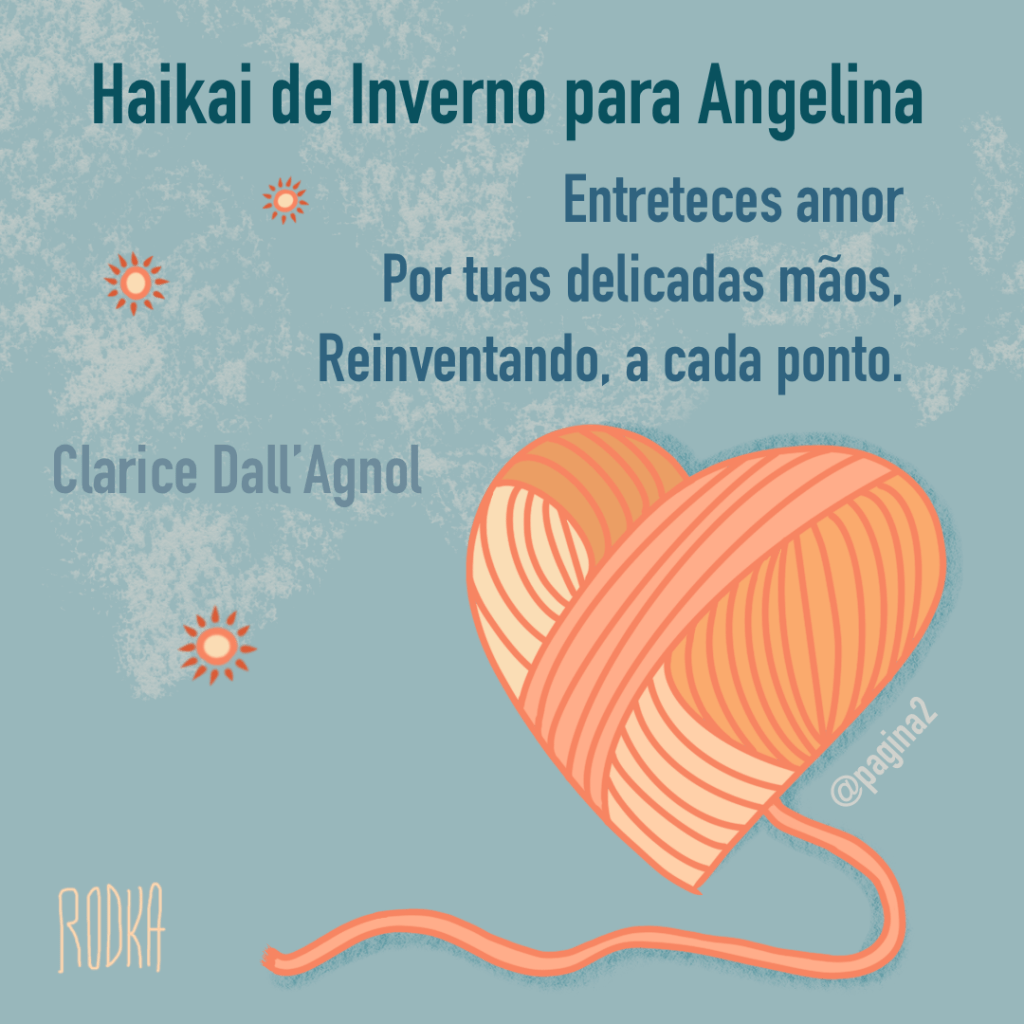 LiteraturaHaikai de inverno para Angelina 15/03/202117/03/2021 claricedc imagem: Cassiano Rodka Entreteces amor Por tuas delicadas mãos, Reinventando, a cada ponto. Compartilhe: Clique para compartilhar no Facebook(abre em nova janela) Facebook Clique para compartilhar no X(abre em nova janela) 18+ Curtir Carregando... Publicado por claricedc Ver todos os posts de claricedc