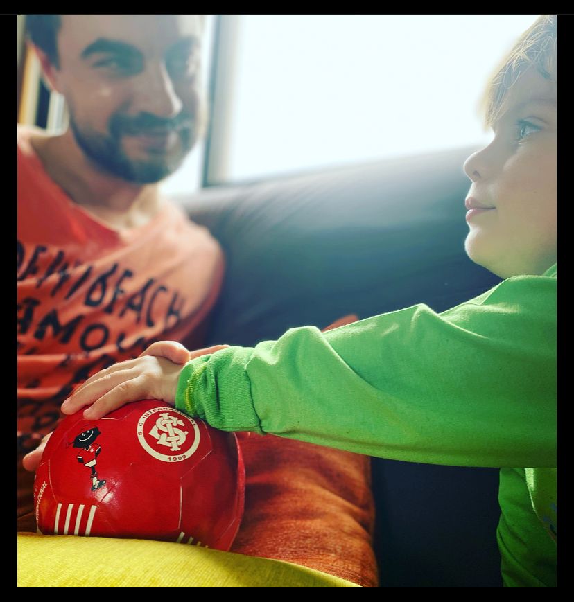 Ele saltou por cima da bola do guri. E fincou o único pé no campo. Ele sorri. E esfumaça por aí. Vibra. Canta. Torce. Dança. E ele sempre dorme, na bola do guri. Que juntos brincam. E pedem. E ganham. E, às vezes, também sofrem. Ele usa vermelho e branco. Como o guri. E tomam chimarrão. E conversam de montão. O saci já conhece e sabe. E acompanha o guri. Que cresce… E vira gente grande. Mas, ainda, seguem… Na torcida. Na busca. E na espera. De um pouco de gol…
